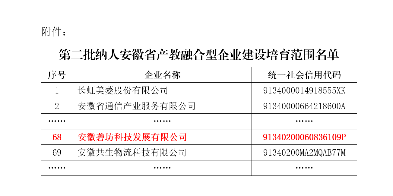 近期,省發(fā)展改革委、省教育廳、省人力資源社會保障廳公布第二批安徽省產(chǎn)教融合型企業(yè)建設培育范圍名單,安徽礱坊科技發(fā)展有限公司成功入選。