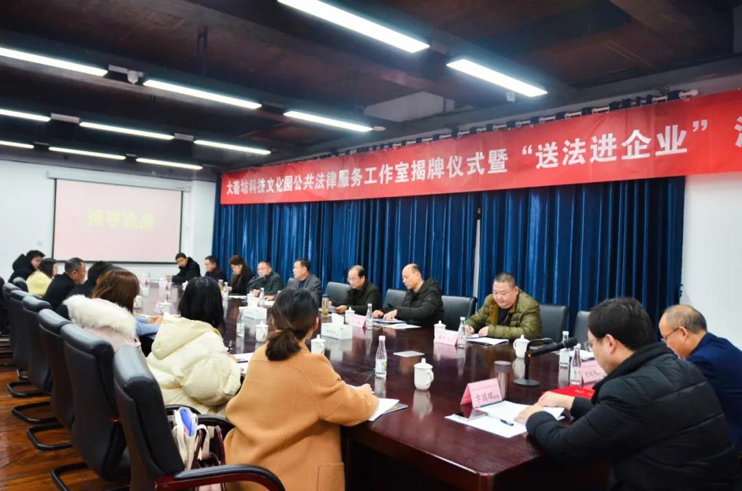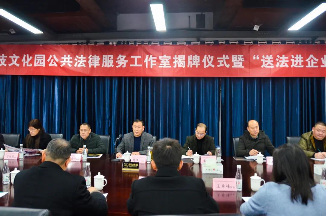 12月11日,大礱坊科技文化園公共法律服務工作室揭牌儀式暨“送法進企業(yè)”活動在園開展,區(qū)司法局、區(qū)委政法委、區(qū)法院、區(qū)檢察院、區(qū)工商聯(lián)、區(qū)經(jīng)信局、區(qū)委常委、政法委書記魏峰及各成員單位、園區(qū)負責人、企業(yè)代表等50余人出席活動。